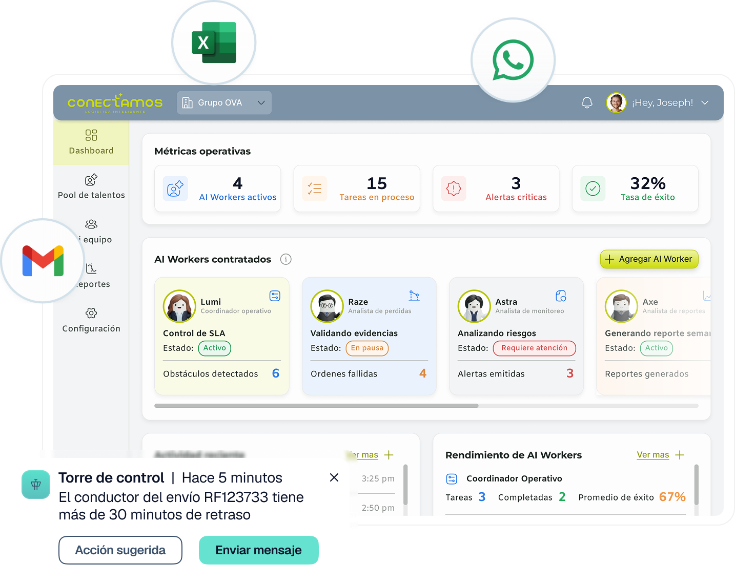 Anticipa retrasos e inconsistencias y recibe notificaciones en WhatsApp o en tus sistemas actuales.